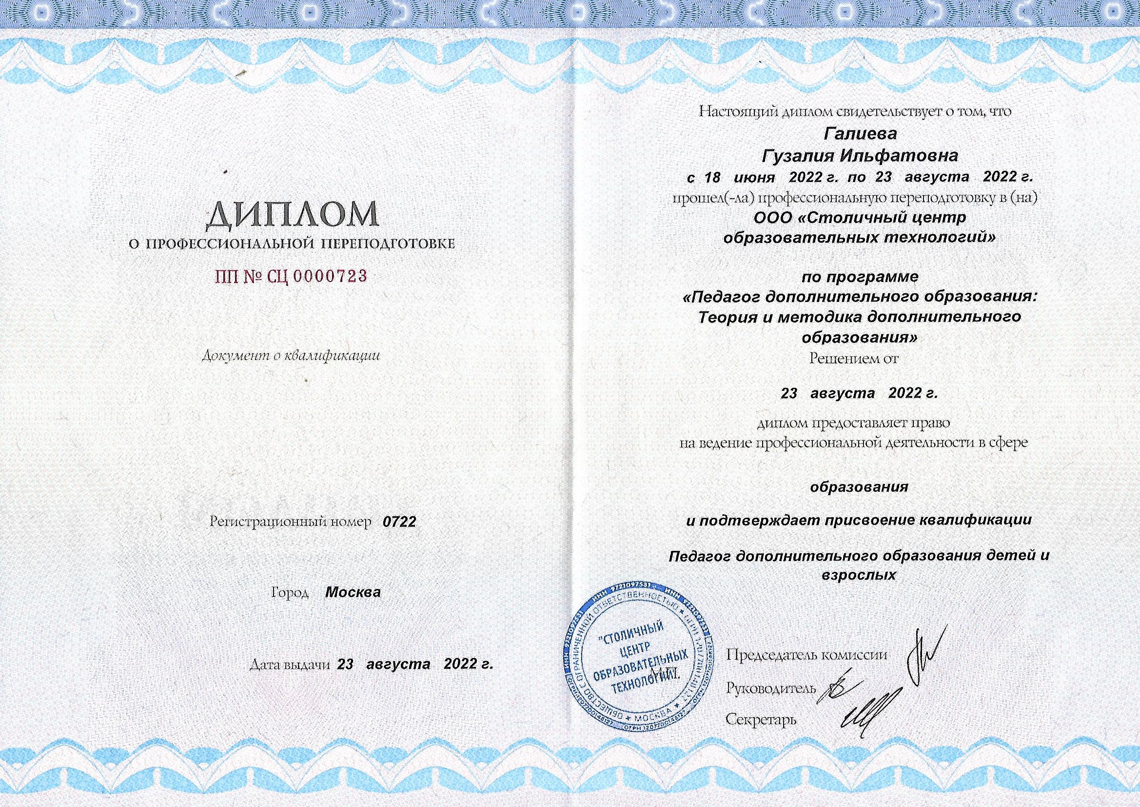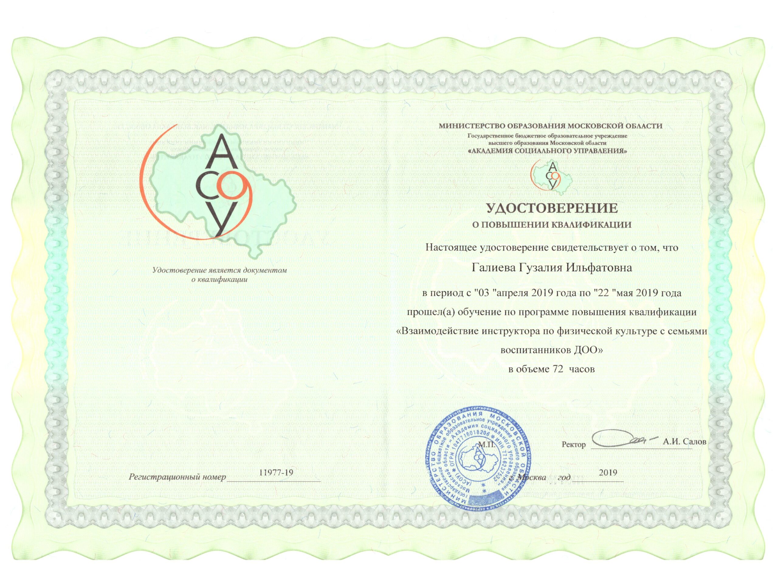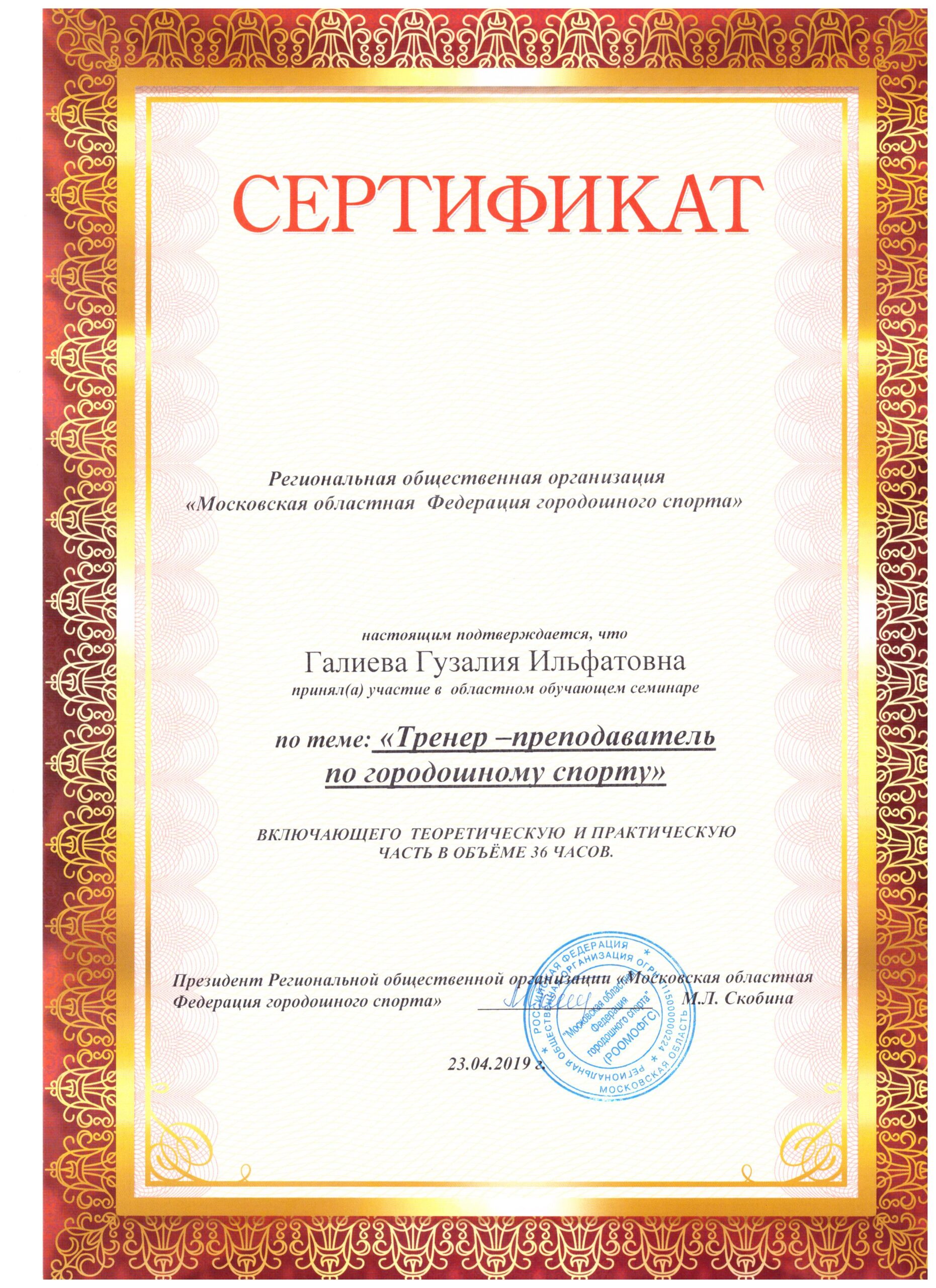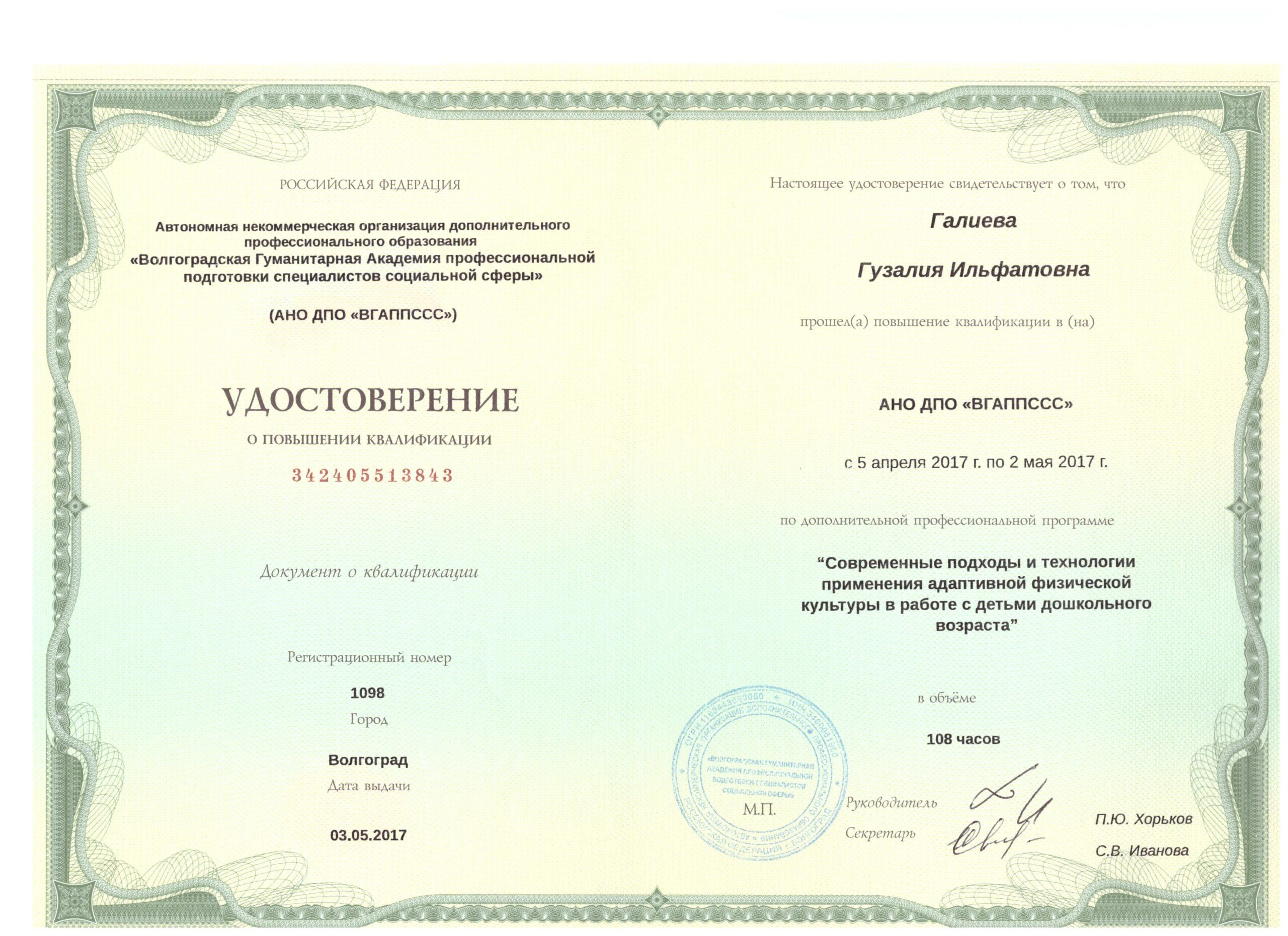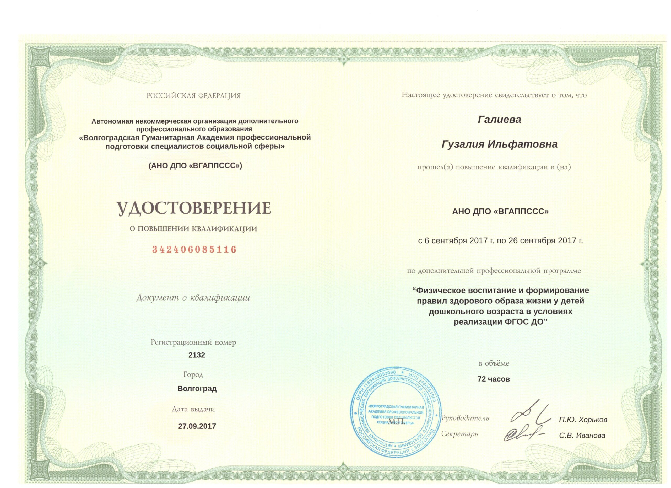 - 2007г. Татарский государственный гуманитарно — педагогический университет,квалификация «педагог по физической культуре» по специальности «Физическая культура»